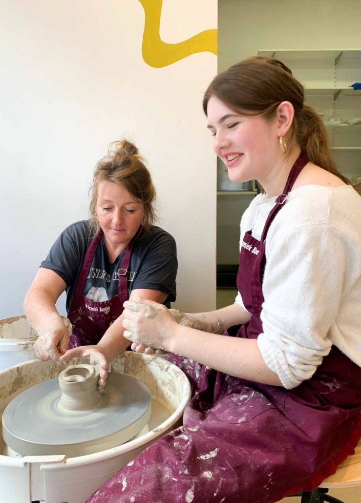 In deze kennismakingsworkshop kom je samen als ouder samen met je tiener (14+) en leer je een aantal basisstappen van het pottenbakken op de draaischijf. Na een korte demonstratie gaan we stapsgewijs door het draaiproces heen. Er is plek voor acht personen dus verwacht veel begeleiding. Je gaat leren centreren, een cilinder draaien en mag zelfstandig oefenen met bolletjes klei van ongeveer 500 gram. Uit ervaring weten we dat je niet kan voorspellen wat er uitkomt maar je gaat iets maken, no doubt! Uit je pogingen kies je zelf één mooie vorm en deze wordt door ons daarna nog een beetje afgewerkt, gestookt, geglazuurd en nog een keer gestookt. Na ongeveer acht weken krijg je van ons een seintje met het pickup-moment om jullie zelf gemaakte kunstwerk op te komen halen.