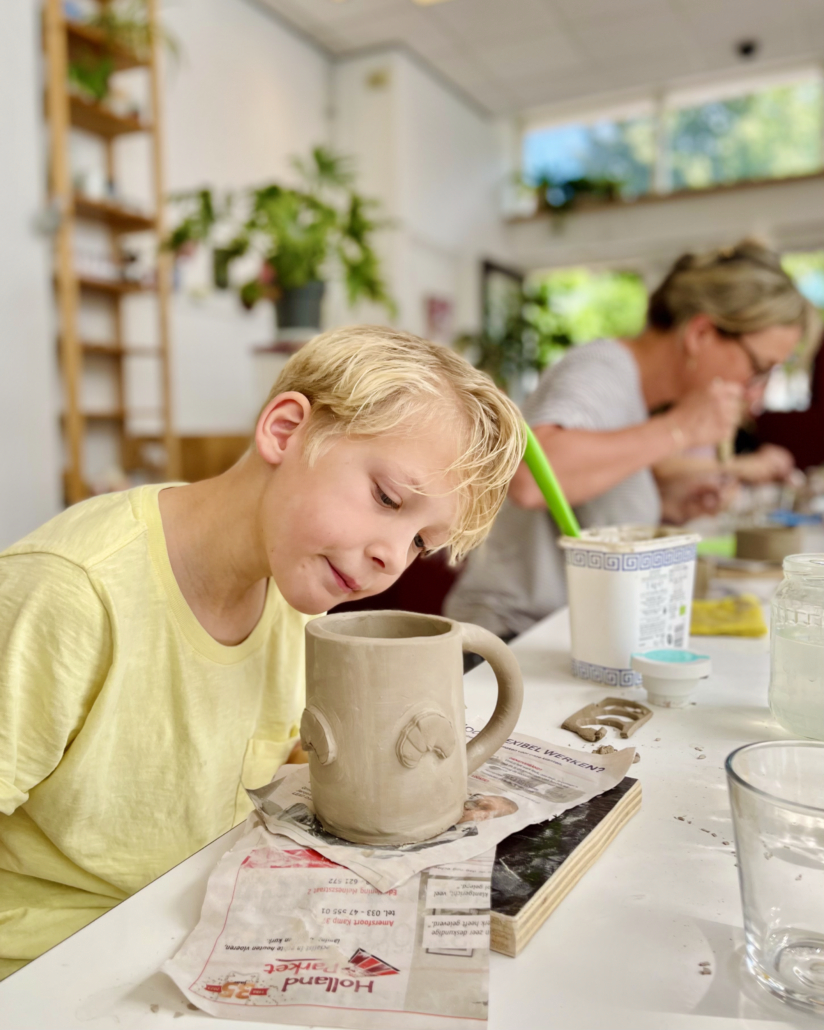 Samen creatief aan de klei! Begin je dag lekker samen in de vakantie in ons atelier. Jullie krijgen een bonkje klei en bedenken met elkaar wat jullie willen maken. Denk aan een ontbijtsetje, een wandobject, een dierenkandelaar of bedenk je eigen kunstwerk. Voorbeelden genoeg en we helpen jullie natuurlijk. We leren jullie iets opbouwen met plakken, rolletjes of een mal. En dingen maken die je kan gebruiken, ophangen of neerzetten. Je beschildert het werk met een onderglazuur.
