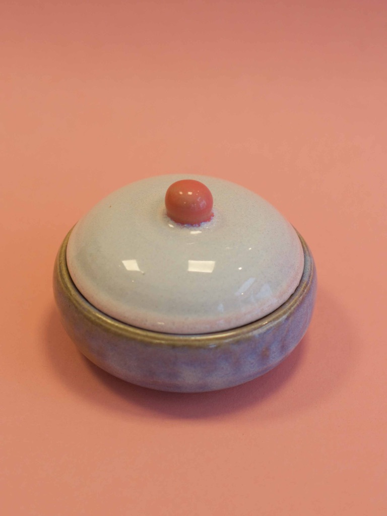 Een klein sieradenpotje met groot karakter, gedraaid door Marjolein in ons atelier op de draaischijf. Het glazuur is opaalkleurig.