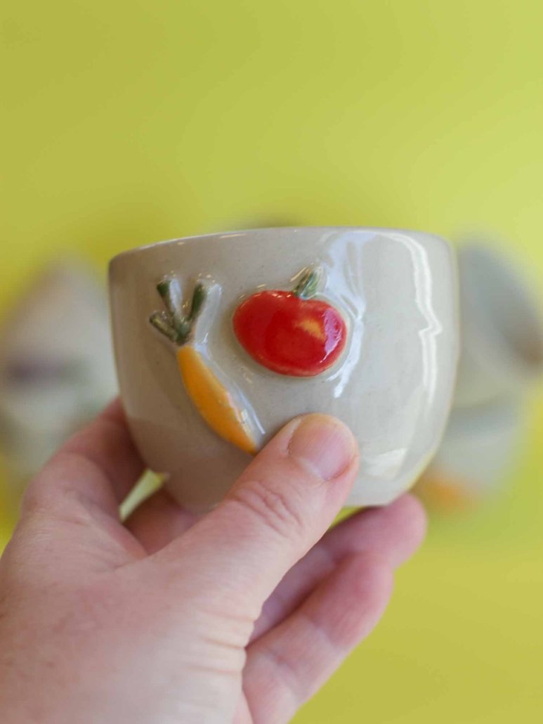 Elke mok in de Viva la Veggie collectie is uniek. Met de hand gedraaid op de draaischijf in ons atelier in Amersfoort, afgewerkt met een subtiel transparant glazuur en gestookt op 1220 graden. De veggies? Die zijn stuk voor stuk met de hand uitgesneden en zorgvuldig met glazuur beschilderd door Marjolein. Van aubergine tot appel, van prei tot peer ā een ode aan alles wat groeit en bloeit. Geen massaproductie, maar pure ambacht. Perfect voor veggie (en fruity) fans, moestuinliefhebbers of iedereen die houdt van een beetje speelsheid in zān servies.