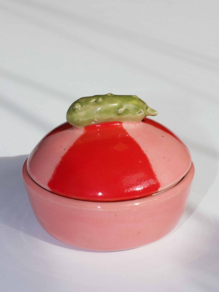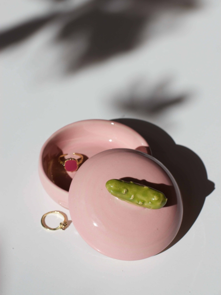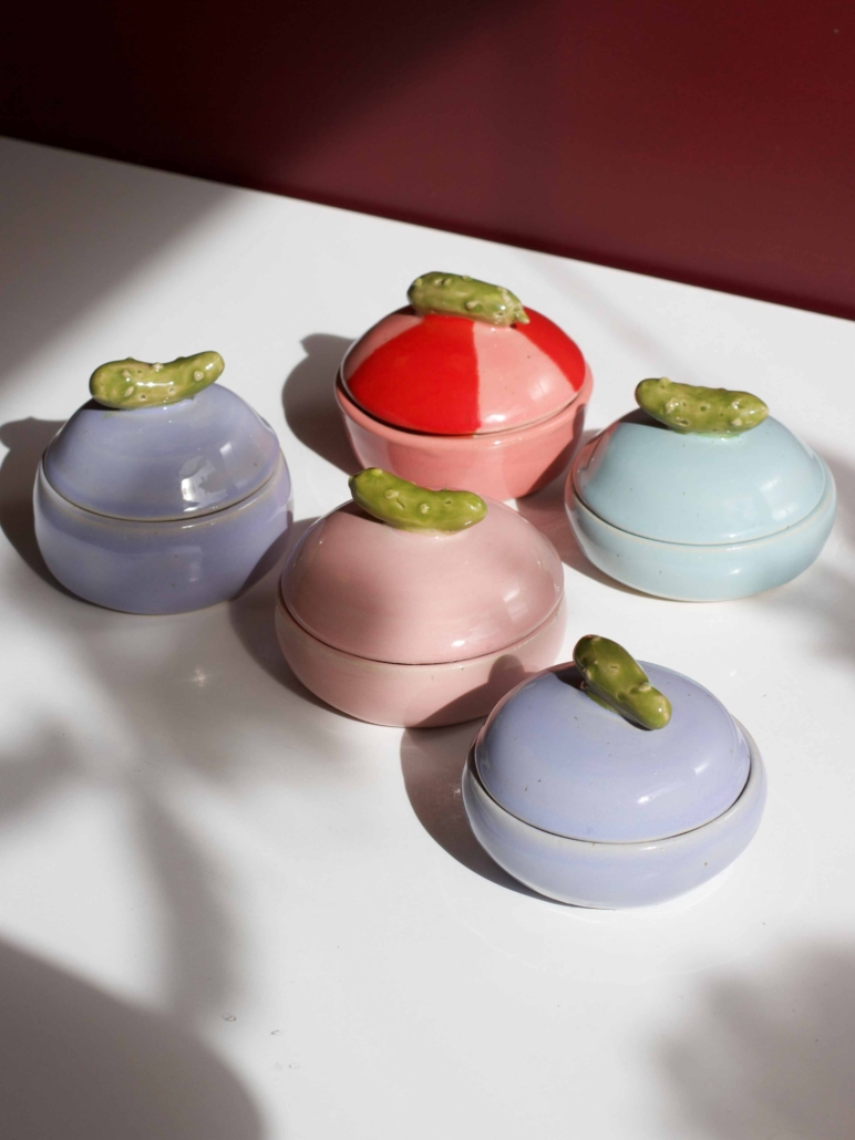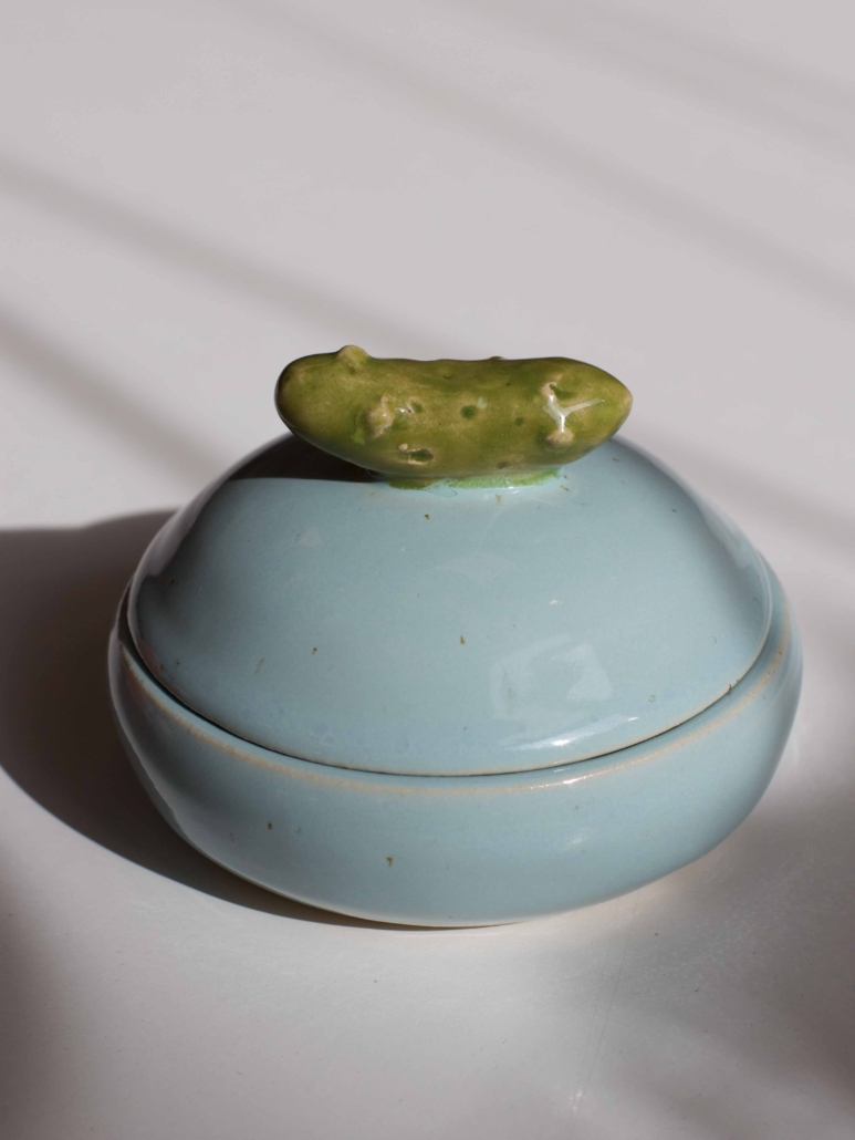 Marjolein draait de potjes, de augurken zijn handgevormd—elk anders, allemaal even eigenwijs. Een klein sieradenpotje met groot karakter.