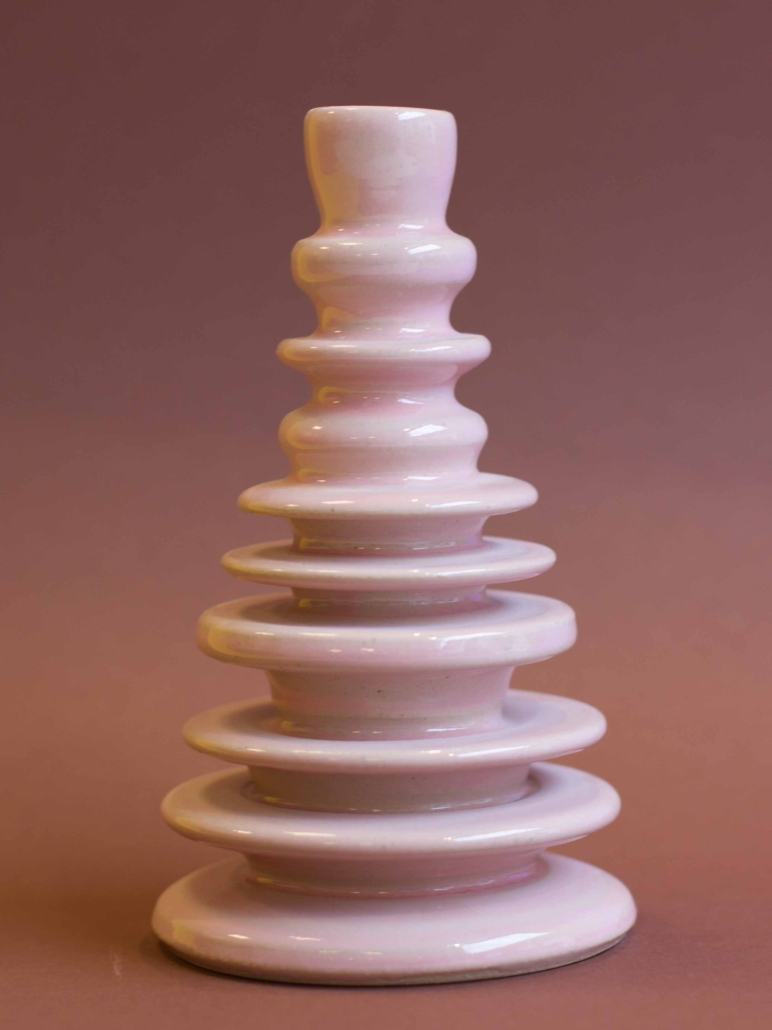 In ons atelier draait Marjolein deze schijfkandelaren stuk voor stuk met de hand op de draaischijf.