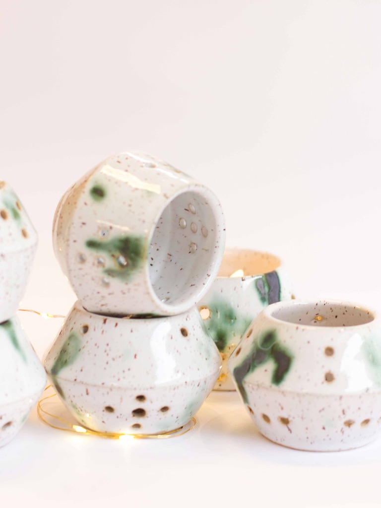 Soft glow en slow light. Deze handgedraaide waxinelichthouder is gemaakt door Marjolein. Elke vorm is net even anders maar allemaal zijn ze met wit glazuur bedekt en groene koperoxide accenten. Jij gaat voor deze maar de exacte uitvoering blijft nog even een surprise. Perfect voor een avond waarop niets hoeft en het licht zacht mag zijn.